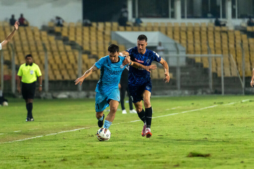 The Blasters, meanwhile, weathered the early storm and gradually found rhythm through Adrián Luna’s midfield orchestration. The Uruguayan nearly produced a moment of magic midway through the first half, sending a delightful pass for Tiago Alves, whose curling effort drifted inches wide of the far post. Soon after, Koldo Obieta forced Phurba Lachenpa into a low save with a sharp strike from the left flank.