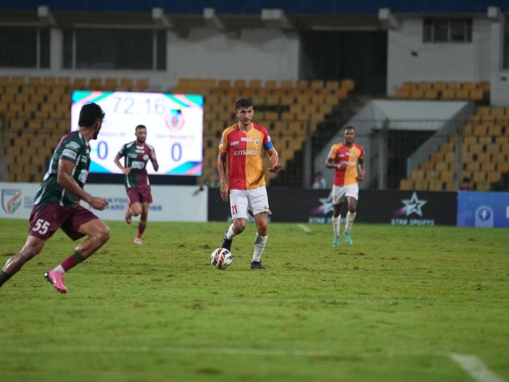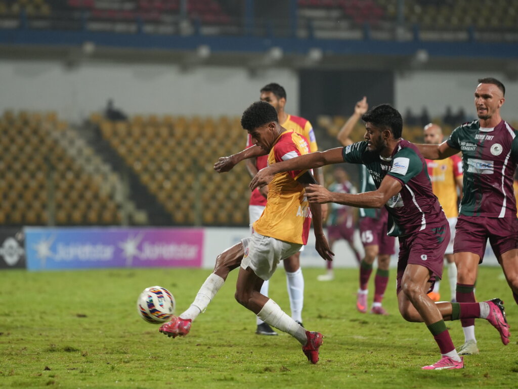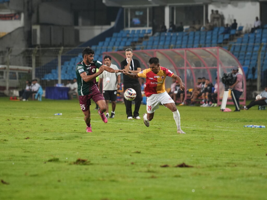 From the opening whistle, East Bengal appeared more settled. They pressed high and forced early errors in Mohun Bagan’s midfield. In just the second minute, Rakip dispossessed Anirudh Thapa on the right and squared the ball to Miguel, whose shot was blocked by the Mariners before being cleared to safety. It set the tone for a cagey encounter defined by half-chances and tactical duels.